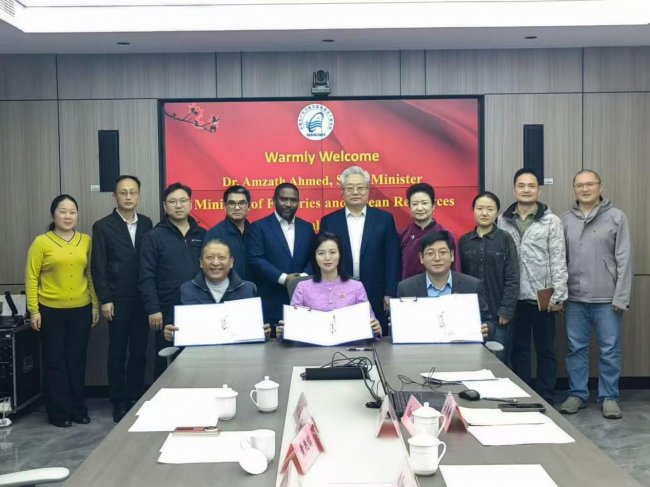 2月8日,马尔代夫渔业和海洋资源部国务部长阿迈德博士、中国城市发展联盟海外联合发展工作委员会主任黄兆锦带领访问团一行到中国水产科学研究院南海水产研究所访问交流,就推动黄鳍金枪鱼深远海养殖产业化深入交流,并举行三方科技合作意向书签约仪式。在阿迈德部长、黄兆锦主任和与会嘉宾共同见证下,南海水产研究所与马尔代夫美华投资公司、广东创越实业投资有限公司共同签署《科技合作意向书》。根据协议,三方将建立为期5年的合作伙伴关系,聚焦黄鳍金枪鱼等深远海高值鱼类,在全产业链技术攻关(繁育、饲料、装备、加工)、深远海养殖示范、新品种开发、品牌与市场开拓、国际科创平台共建、项目联合申报及人才交流等七个方面开展全面合作。